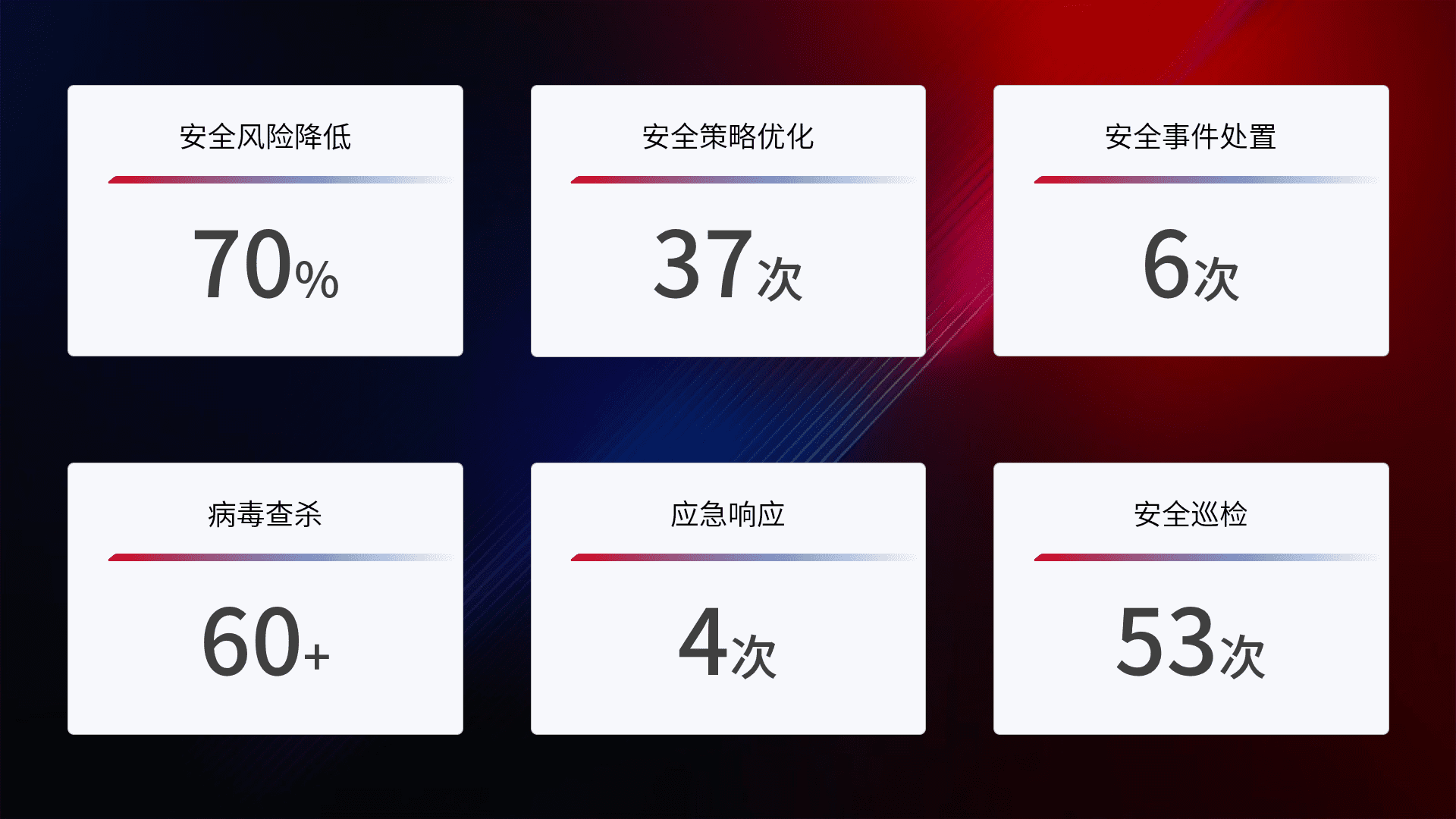 提供全面的安全事件报告体系,,,,包括处置报告、、、、周报、、季度和年度总结,,,,结合持续监控,,帮助客户深入了解网络安全状况。。。
